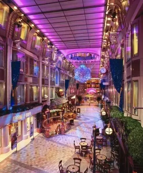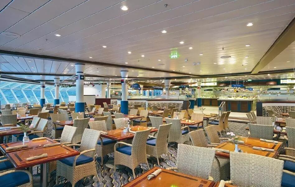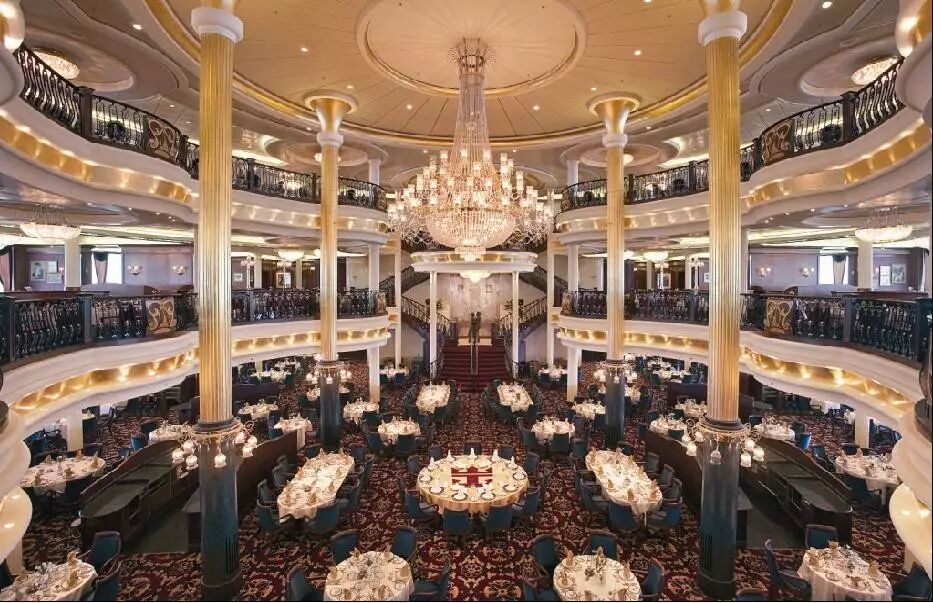 豪华典雅的主餐厅横跨三层甲板,可容纳近两千名宾客同时用餐。